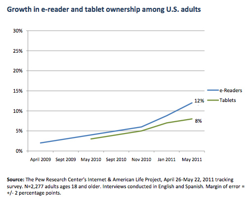 Good news from Pew Research Center's survey (run from April 26 to May 22 among 2,277 adults, margin of error = +/- 2%) on e-Reader ownership: